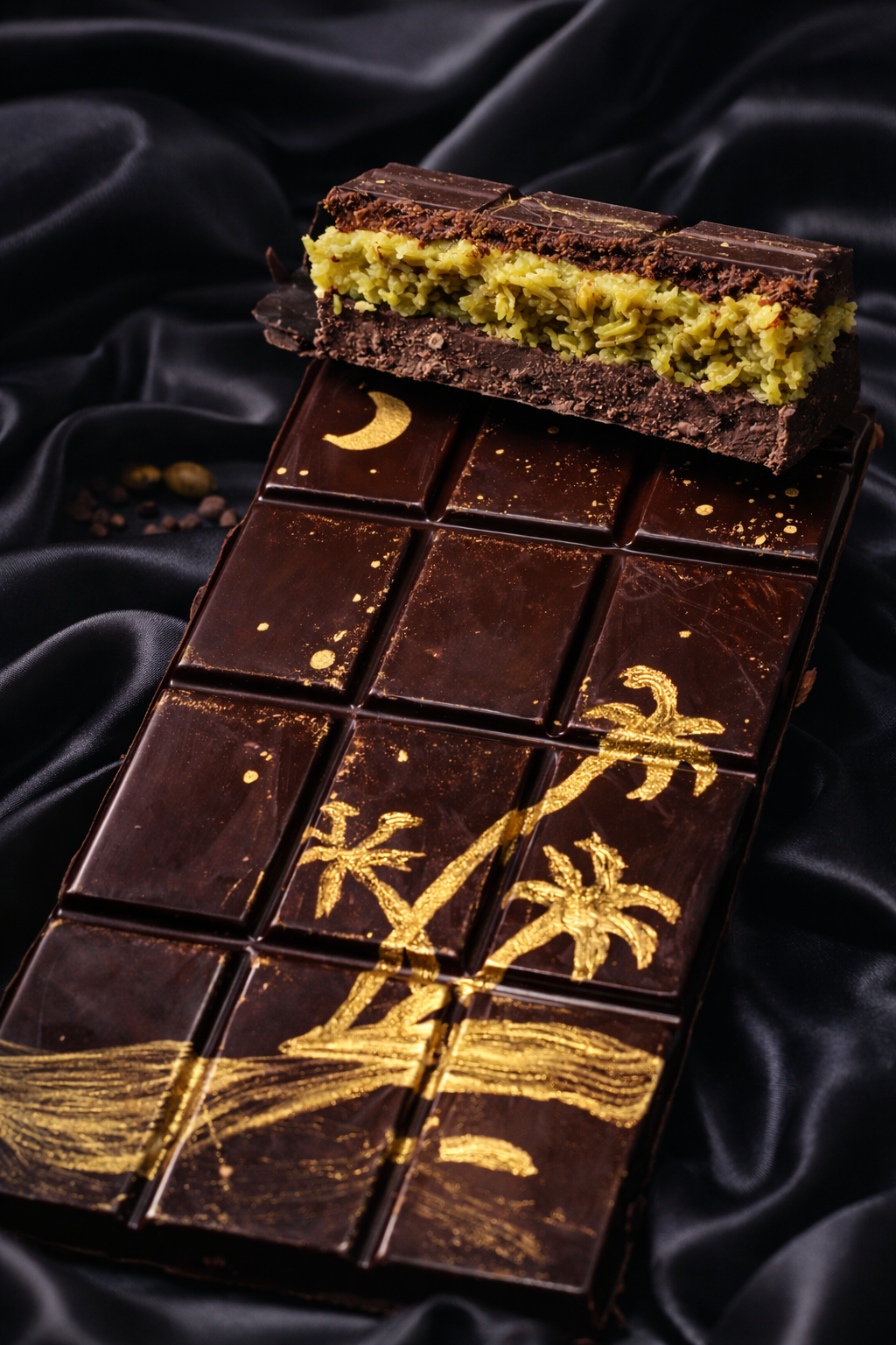 First Stop Midnight Oasis: Discover decadent dark chocolate with layers of pistachio in different textures