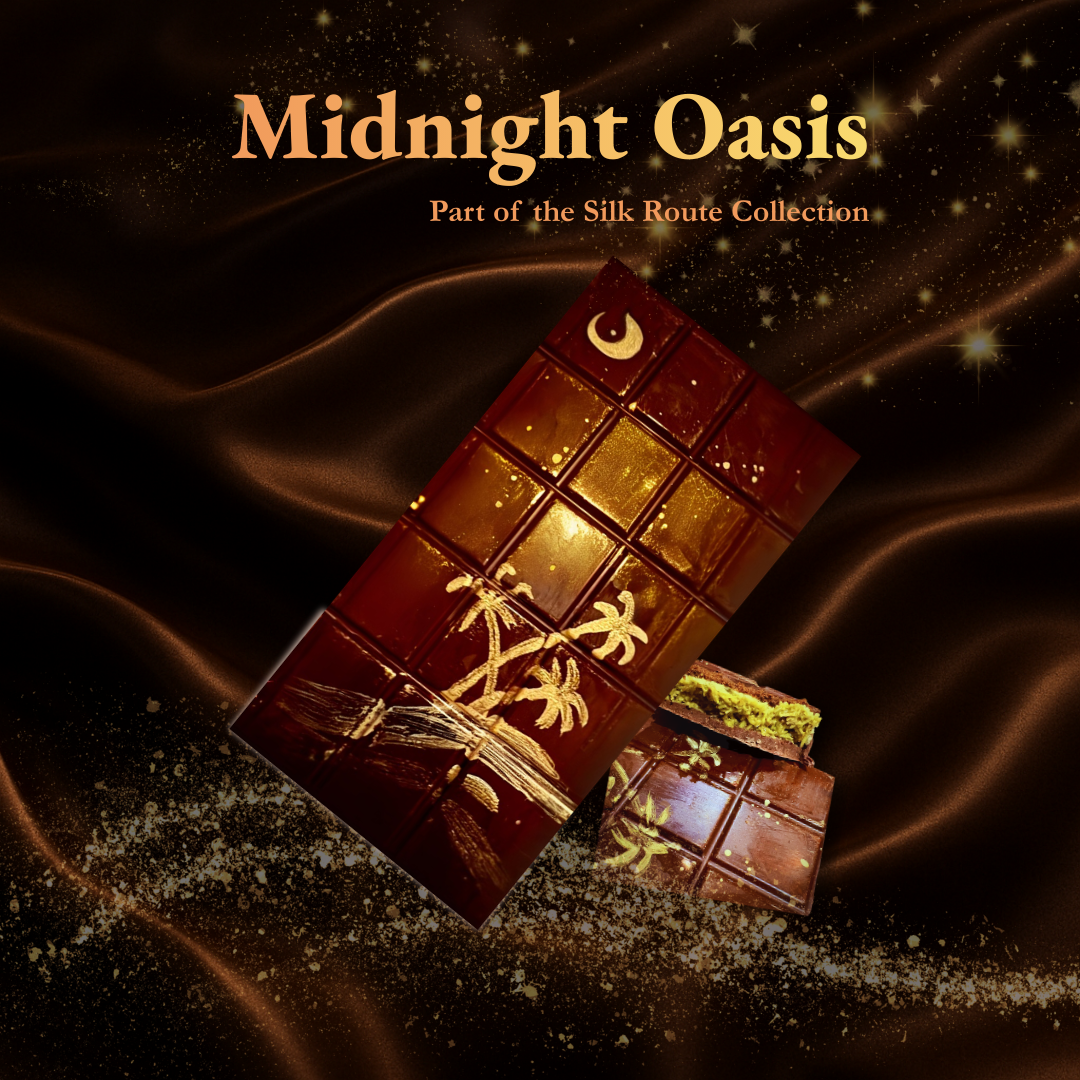 Midnight Oasis is an invitation to pause and indulge, where rich dark chocolate meets layers of pistachio praline, silky ganache and delicate crunch. Crafted to be savoured and shared, it transforms every moment into quiet luxury.