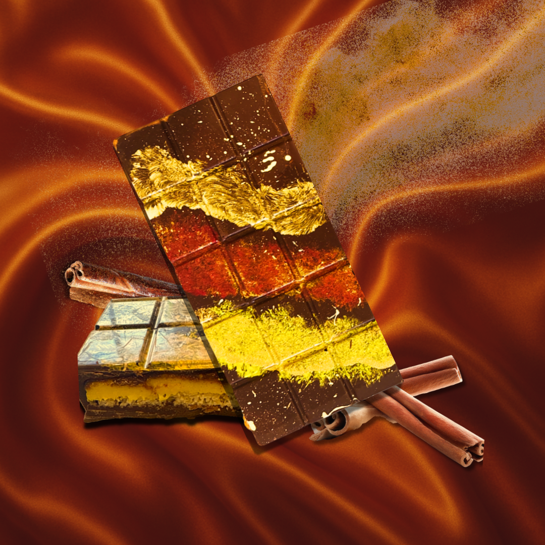 Warm spices, golden hues and layered textures come together in a composition that is both bold and refined. Cinnamon walnut praline meets a luminous turmeric ganache, balanced with delicate honeyed kataifi for a crisp finish.